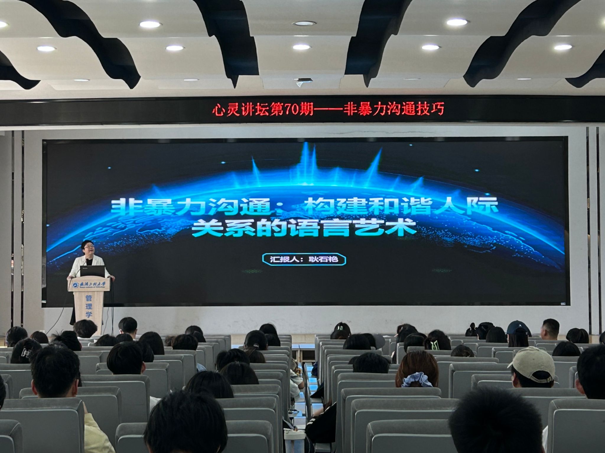 讲座开场,耿石艳老师以亲和姿态登上讲台,一句“各位同学,我是耿石艳,非常荣幸能与大家共同探讨‘非暴力沟通’”,瞬间拉近了与听众的距离,成功营造出良好互动氛围。