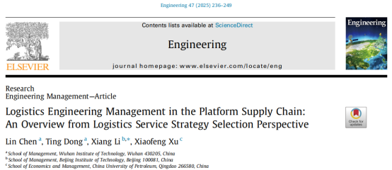(通讯员 于怡迪)近日,英国365集团网站管理科学与工程系陈林副教授与硕士研究生董婷在国际权威期刊《Engineering》上发表了题为“Logistics Engineering Management in the Platform Supply Chain: An Overview from Logistics Service Strategy Selection Perspective”的综述论文。英国365集团网站为该论文的第一作者单位,管理科学与工程系陈林副教授为第一作者,硕士研究生董婷为第二作者。合作单位有北京理工大学、中国石油大学(华东)。