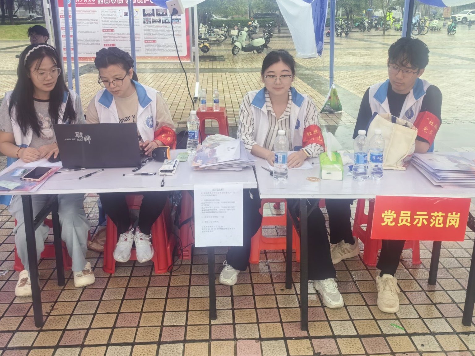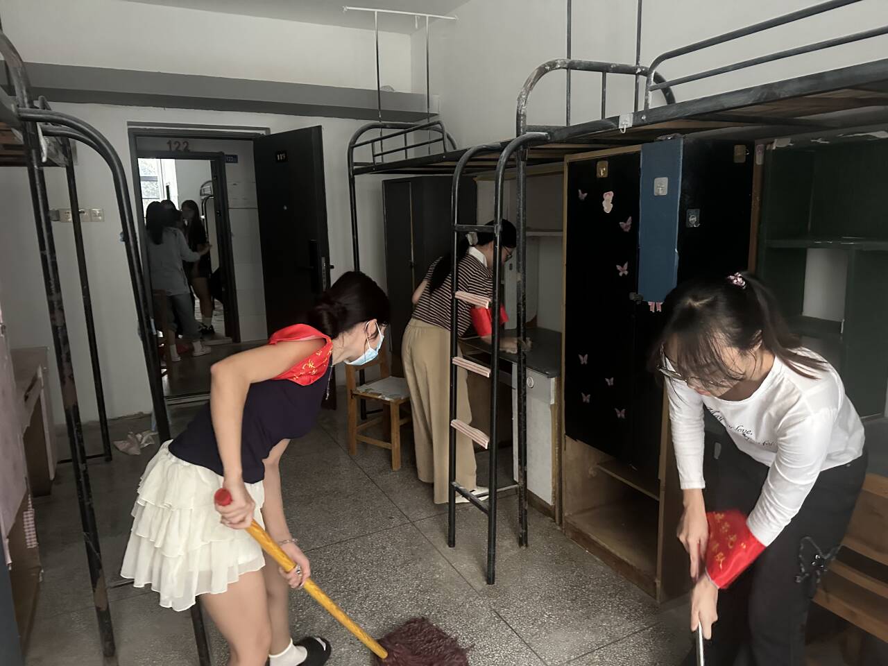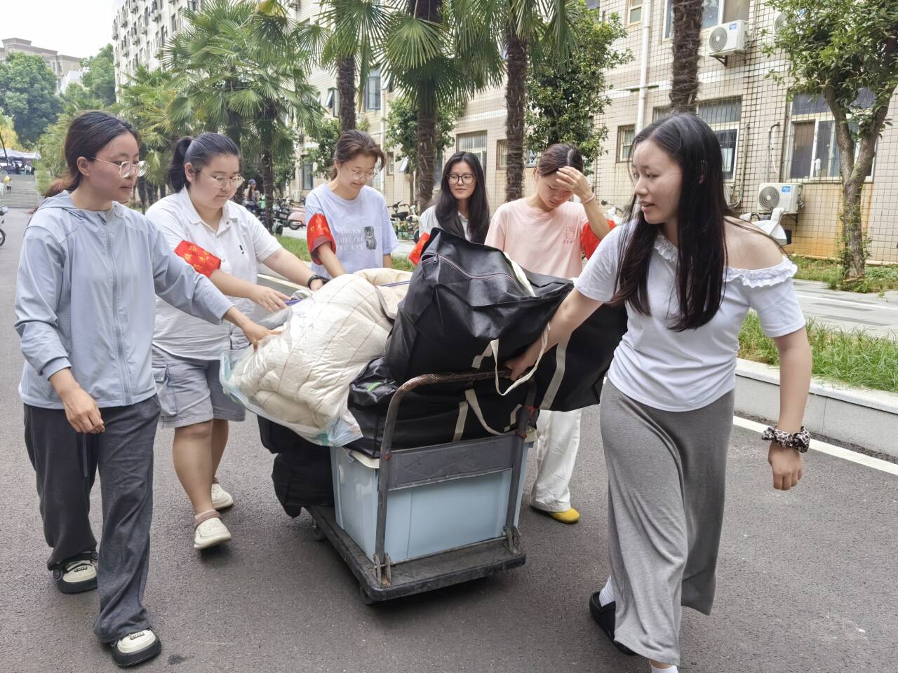 在迎新一线,“红旗荣光”党员先锋队作为新生进入大学后最先接触的朋辈群体,他们佩戴红色袖章,以热情的笑容、耐心的解答、周到的服务,成为校园里一道亮丽的“红色风景线”。迎新工作启动前,公司率先开展“宿舍焕新”专项行动,员工党员积极响应、主动参与,对百余间新生宿舍开展“全覆盖、无死角”的深度清扫,为迎新工作筑牢前置服务基础。新生报到期间,“党员示范岗”持续值守,党员同志轮流在岗,随时为新生提供咨询引导;“红旗荣光”党员先锋队清晨全员到岗,往返于迎新点和员工公寓之间,为新生搬运行李、对接需求,提供“点对点”精准服务。党员们以热忱奉献筑牢迎新“暖心防线”,让鲜红的党旗在服务一线迎风飘扬,用实际行动让新生初入校园便感受到党组织的关怀与温暖。