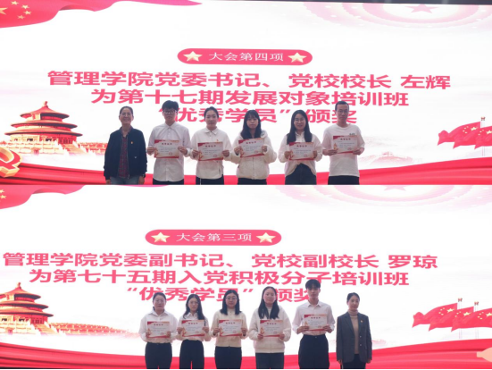 左辉、罗琼分别为第17期发展对象培训班、第75期入党积极分子培训班“优秀学员”颁发荣誉证书。