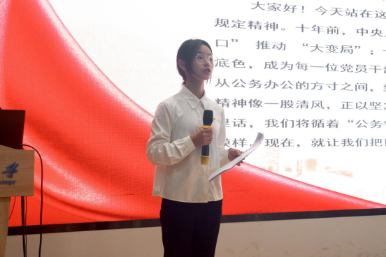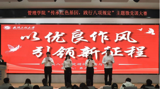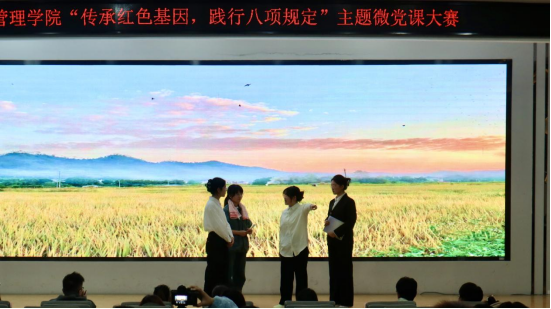 此次大赛紧扣“传承红色基因,践行八项规定”主题,以微党课为载体,让红色精神与作风建设同频共振。5组主讲人立足青年视角,深耕主题内涵,通过红色史料溯源、典型案例剖析、实践路径阐释等多元形式展开分享。有的回溯革命先辈严守纪律、艰苦奋斗的红色故事,探寻中央八项规定精神的历史渊源;有的结合新时代青年党员践行作风建设的鲜活案例,解读八项规定在校园场景中的实践密码;有的通过情景演绎、短视频展示等创新形式,让严肃的纪律教育变得生动鲜活。整场活动以“小切口”展现“大主题”,以“小故事”诠释“大精神”,让红色基因的时代价值与八项规定的实践要求深度融合,为现场师生带来了一场兼具思想性、观赏性与感染力的思想洗礼。