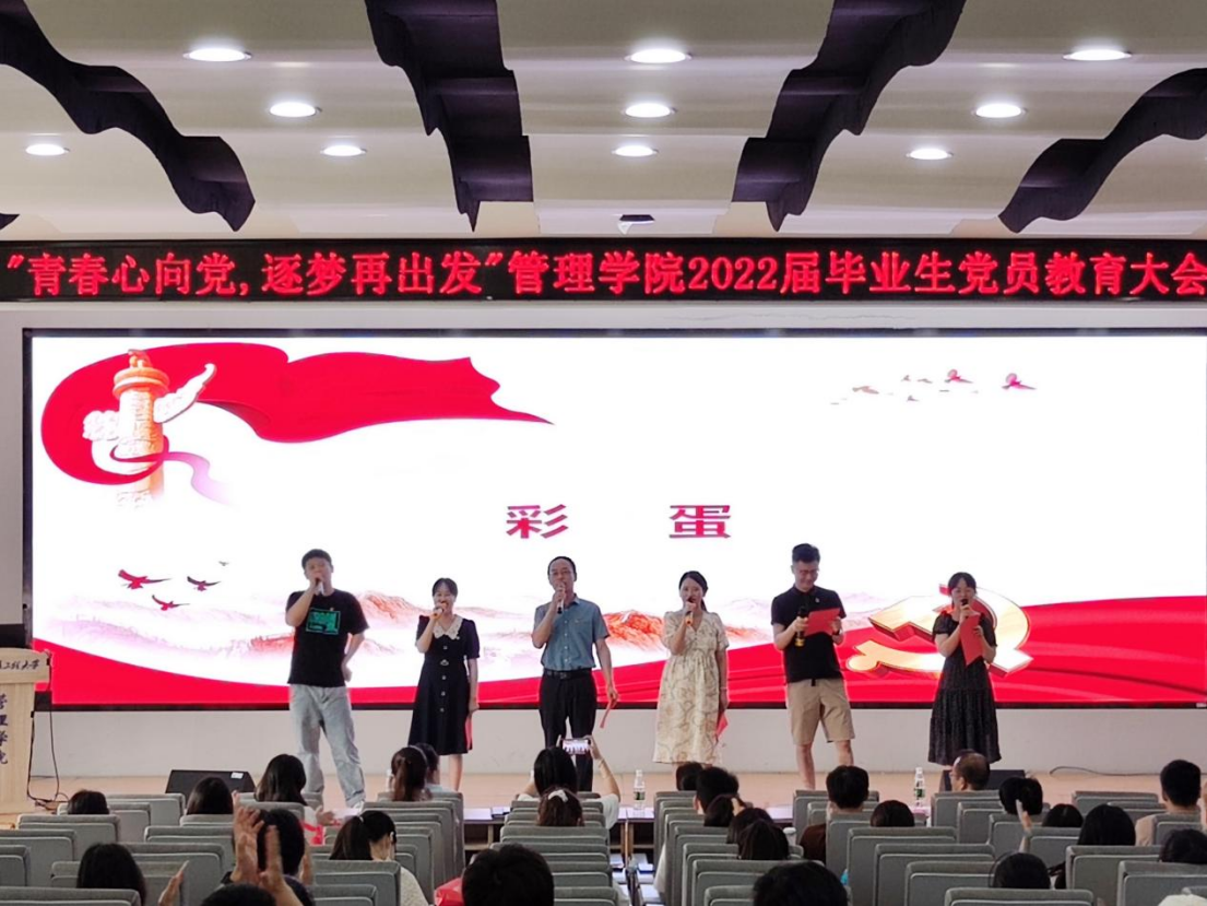“特别环节”将大会推向高潮,各员工党支部书记、全体辅导员为毕业生党员们倾情献唱《我和我的祖国》,号召党员们胸怀“国之大者”,与祖国、与母校,同心同德、同向同行,祝愿大家毕业快乐、前程似锦。此环节给党员们带来了惊喜,大家表示在毕业前能看到平日里严肃认真的支部书记、辅导员为了大家认真准备、真情表演,深深感动。