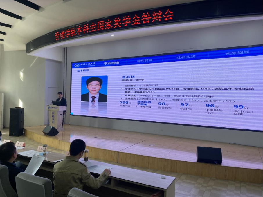 本着公平、公正、公开的原则,此次答辩评审以年级为单元,会前主持人就相关制度、答辩流程、计分方式等作了详细解读,现场公布答辩结果。来自2个年级的12名研究生、3个年级的21名本科生依次进行国家奖学金答辩。他们分别从学业成绩、学术科研、社会实践、志愿服务等多方面展示自己的成长情况,全面客观地阐述了自己参评国家奖学金的核心竞争力,展现了管院学子的风采。