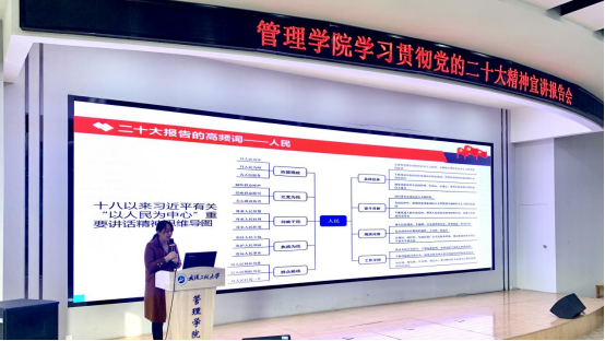 启动仪式后,进行了第一场专家宣讲报告会。公司理论宣讲团成员、公司党委委员、教育部“样板支部”支部书记张曦以“以人民为中心,奋进新征程”为题汇报了自己的学习成果,她从大会的基本概况、报告的主体内容、报告的“高频词”分析、“高频词”的逻辑内涵以及如何贯彻落实等五个方面进行了解读。重点围绕“发展”、“坚持”、“建设”、“人民”、“现代化”等高频词以及他们之间的逻辑关系,对报告中的新理念、新提法、新论断、新要求进行了深入解读。并号召大家,作为教育者要通过全面、系统、深入的学习,始终牢记“为党育人、为国育才”的初心使命和培养什么人、怎样培养人、为谁培养人的根本问题,将学习成效体现在教学、科研、育人的全过程,赋能新文科发展,为培养培养德智体美劳全面发展的社会主义建设者和接班人贡献自己的力量。