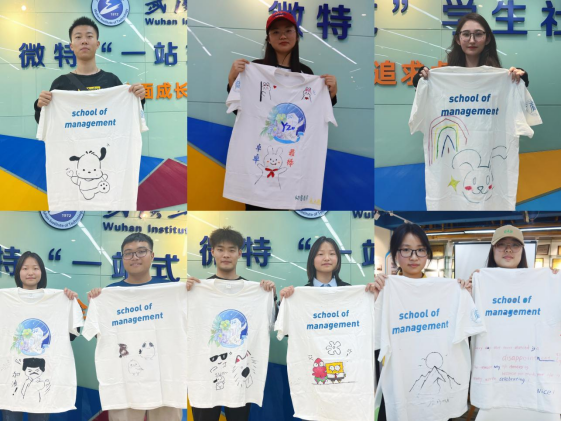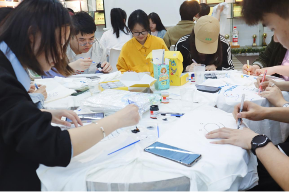 伴随着舒缓轻柔的音乐,同学们投入到认真的绘制中,给纯白单调的T恤绘上缤纷的色彩,创作出一个个独具特色的作品,有的天马行空,有的肆意挥洒,有的还寄予了独特深刻的创作寓意。在绘制过程中,同学们相互配合,协作互助,整个活动现场洋溢着同学们的欢声笑语和情意满满的氛围。