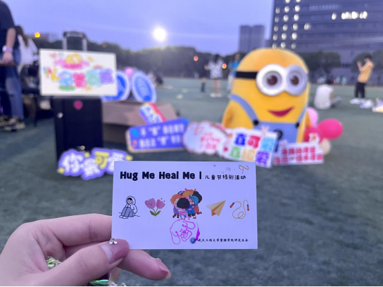 在“请接收我的抱抱”环节,活泼可爱的志愿者和憨态可掬的小青蛙给予路过的同学们大大的拥抱和满满的治愈。“小朋友,儿童节快乐”“未来的每一天都要开开心心”“你是夜空中最亮的星”……同学们放下压力,感受和沉浸于当下的美好与恬静。