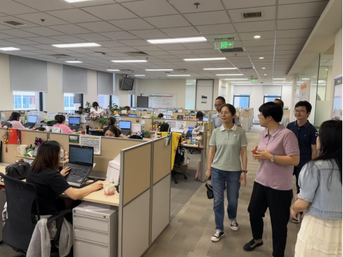 在施耐德电气(中国)有限公司武汉分公司,左辉一行首先实地参观了企业节能增效体验中心、办公场所以及配套环境,详细了解企业能效管理平台运行状况、数据中心搭建以及员工文化。
