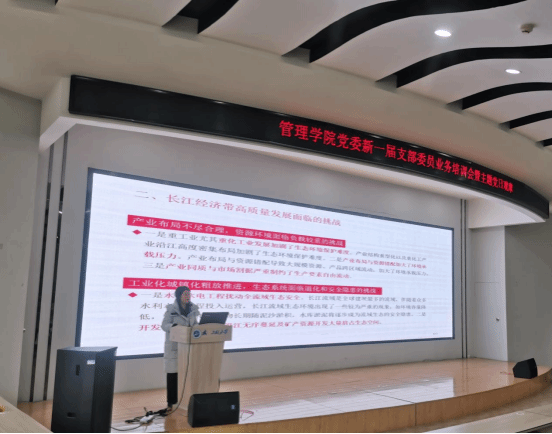 在理论学习交流环节,支部党员王学婷以《贯彻新发展理念,推动长江经济带高质量发展》进行了主题分享,她从历史背景、讲话内容、蕴含意义认真梳理了习近平总书记关于推动长江经济带高质量发展的四次讲话,并结合自身专业背景与研究方向探索提出了推动长江经济带高质量发展的对策。报告脉络清晰、内容充实,让“共抓大保护、不搞大开发”、始终坚持“生态环保”为根本推动长江经济带高质量发展的理念深入大家头脑,
