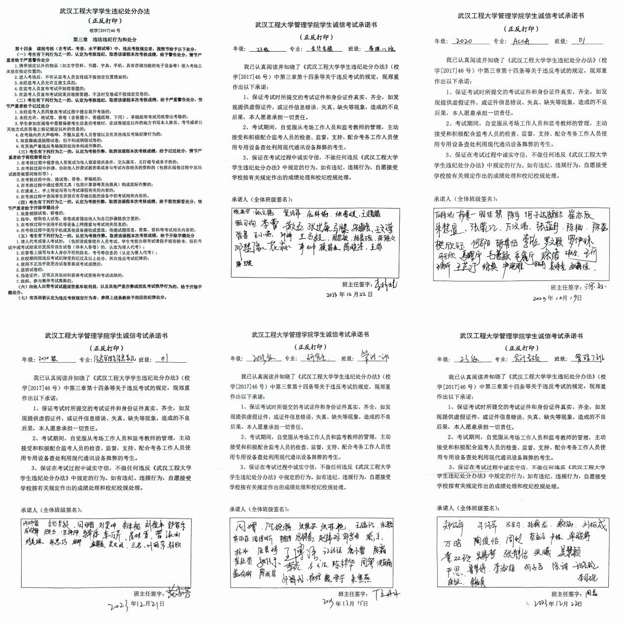 共签一份诚信承诺书。班主任、班干部领读国家有关条例和公司《员工违纪处分办法》,班级同学集体诵读,组织集中签订,加强考前教育、考中监督和考后通报,强化员工诚信考试意识,实现全员覆盖、全体知晓,做到立诚于心、树信于行,让每个考生讲诚信、守规矩、遵法纪。