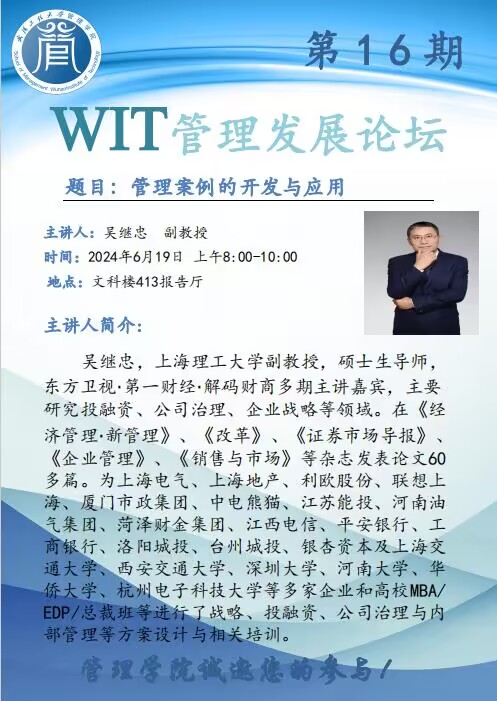 WIT管理发展论坛第16期:管理案例的开发与应用 主讲人:吴继忠 副教授