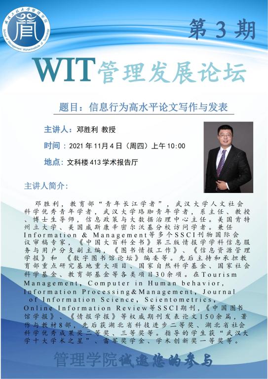 WIT管理发展论坛第3期:信息行为高水平论文写作与发表 主讲人:邓胜利