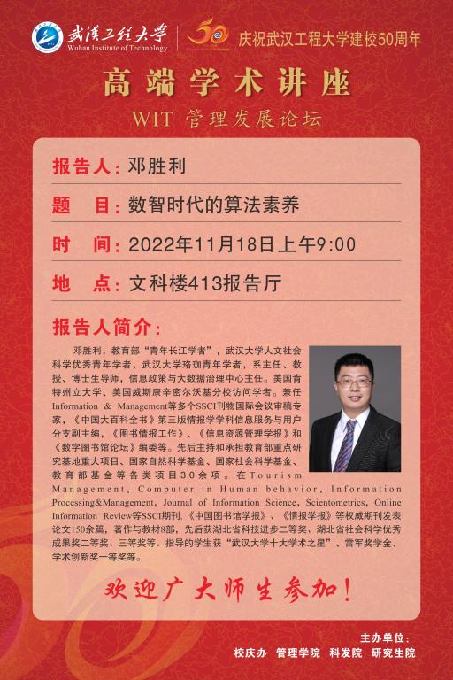 WIT管理发展论坛 高端学术讲座:数字时代的算法素养 主讲人:邓胜利