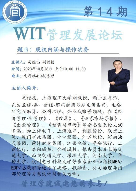 WIT管理发展论坛第14期:股权内涵与操作实务 主讲人:吴继忠 副教授