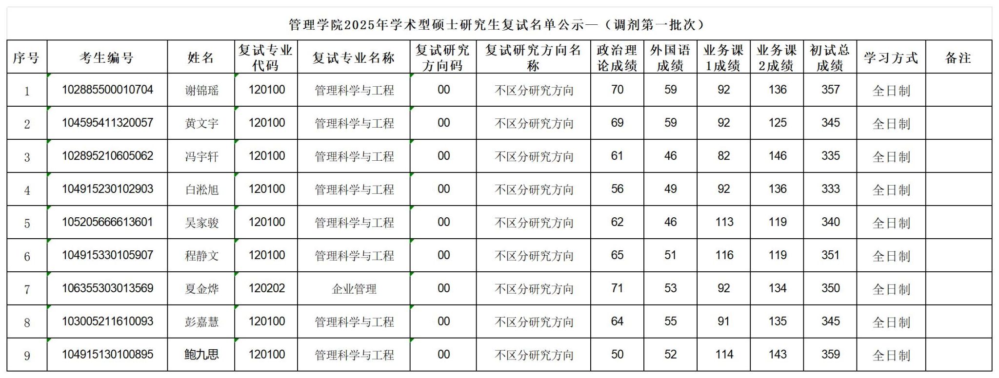 2025年学术型硕士研究生复试名单公示—(调剂第一批次)