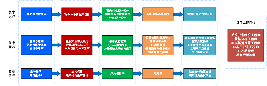 本专业是管理学、计算机、工程等领域的交叉学科,课程设置兼具管理、经济与信息技术等多门学科的关键知识点,员工可以成为既懂信息技术、具备数据分析与编程能力,又懂管理知识的复合型人才。本专业开设多门实践性与操作性强的专业课程和模拟实验类课程,实践实训类课程数量多、占比高,重视对员工创新创业与管理实战能力的培养。总之,这是一个对员工综合素质要求很高的专业。具体课程设置与员工素养、岗位对应如图1所示。